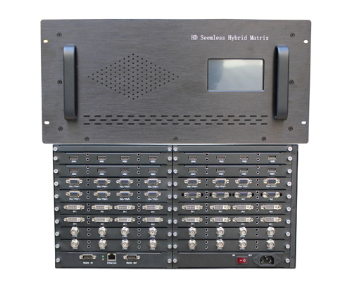 高清混合矩阵矩阵是为了将各种模拟或数字视频信号统一进行重新分配和组合的交换设备。该设备可将多路CVBS、VGA、YPbPr、HDMI、DVI和 SDI视频输入信号切换到多路输出通道的任意通道上去。且输出通道可任意选择CVBS、VGA、YPbPr、HDMI、DVI或SDI接口。可广泛用于需 要进行多种视频信号分配和组合的场合,应用领域涉及军工、多媒体教学、电视电话会议、金融、科研、气象等领域。