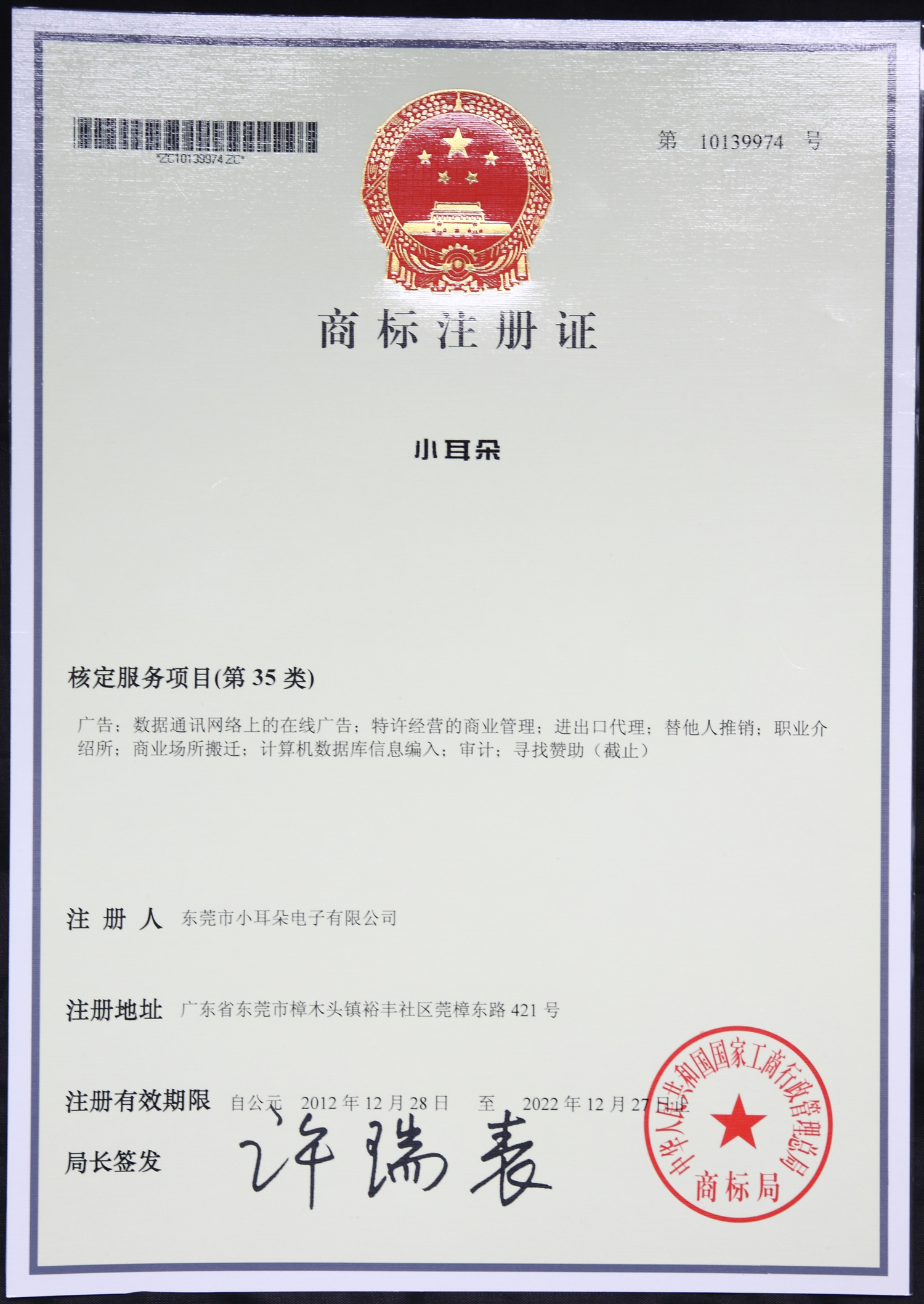 “小耳朵”商标注册证