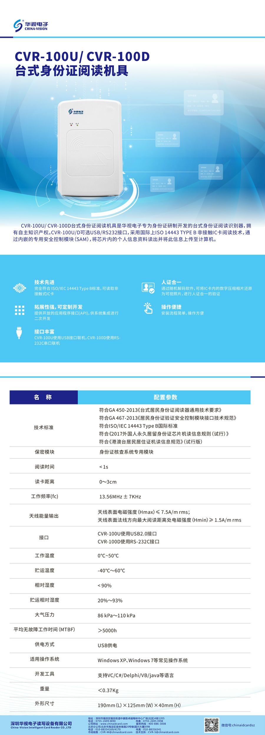CVR-100U/ CVR-100D台式居民身份证阅读机具是华视电子专为第二代居民身份证研制开发的台式身份证阅读识别器,拥有自主知识产权。CVR-100U/D可选USB/RS232接口,采用国际上ISO 14443 TYPE B 非接触IC卡阅读技术,通过内嵌的专用安全控制模块(SAM),将芯片内的个人信息资料读出并将此信息上传至计算机。