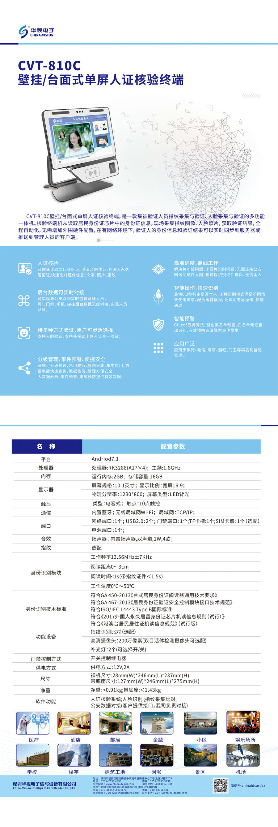 CVT-810C壁挂&台面单屏人证合一核验设备,是CVT810A的升级款,该设备是一款集被验证人员指纹采集与验证、人脸采集与验证的多功能一体机。核验终端机从读取身份证芯片中的身份证信息,现场采集指纹图像、人脸照片,获取验证结果,全程自动化,无需增加外围硬件配置,在有网络环境下,验证人的身份信息和验证结果可以实时同步到服务器或推送带管理人员的客户端。