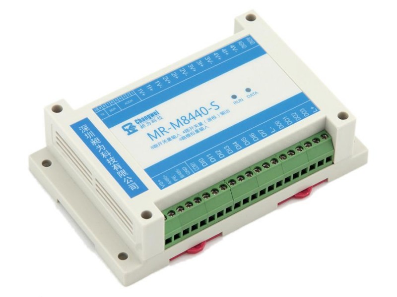 MR-M8440-S为RS485型隔离8通道开关量输入(DI)、4通道开关量输出(DO)、4通道模拟量输入(AI)信号采集控制设备:8路隔离的开关量输入通道,可实现干接点(开关触点)信号及不高于30V DC湿接点(电平)信号的接入检测;4路隔离的开关量(源极)输出通道,触点容量为100mA/30VDC,可实现小功率负载共电源正极的远程控制;4路隔离的模拟量输入通道,每个通道可输入不同类型信号,支持标准的0~5V、1~5V电压信号和0~20mA、4~20mA电流信号输入,以及其它不超过5V电压、20mA电流的非标准信号输入,并具有断线检测功能。