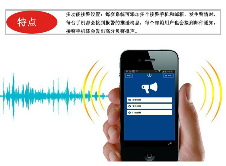 2. 多功能接警设置:每套系统可添加多个接警手机和邮箱,发生紧急情况时,每台被授权手机都会接到报警推送消息,每个授权邮箱用户也会收到邮箱通知。
