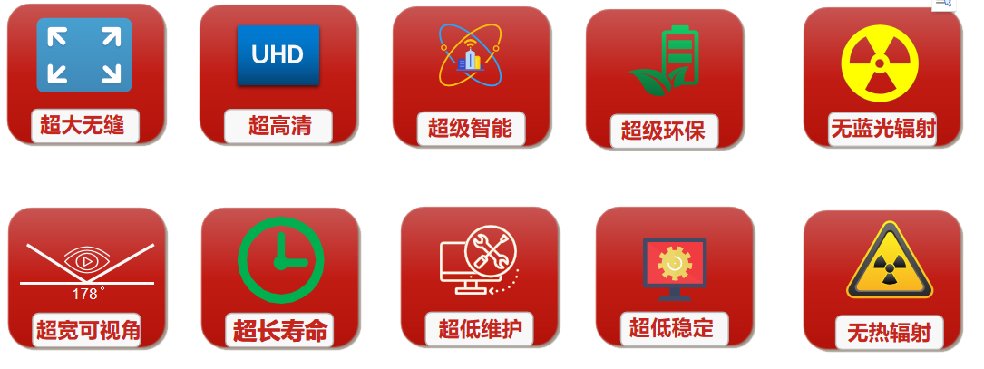 整屏物理无缝、无蓝光辐射、无热辐射、节能环保、可视化智慧管理、使用成本低、超低维护量。