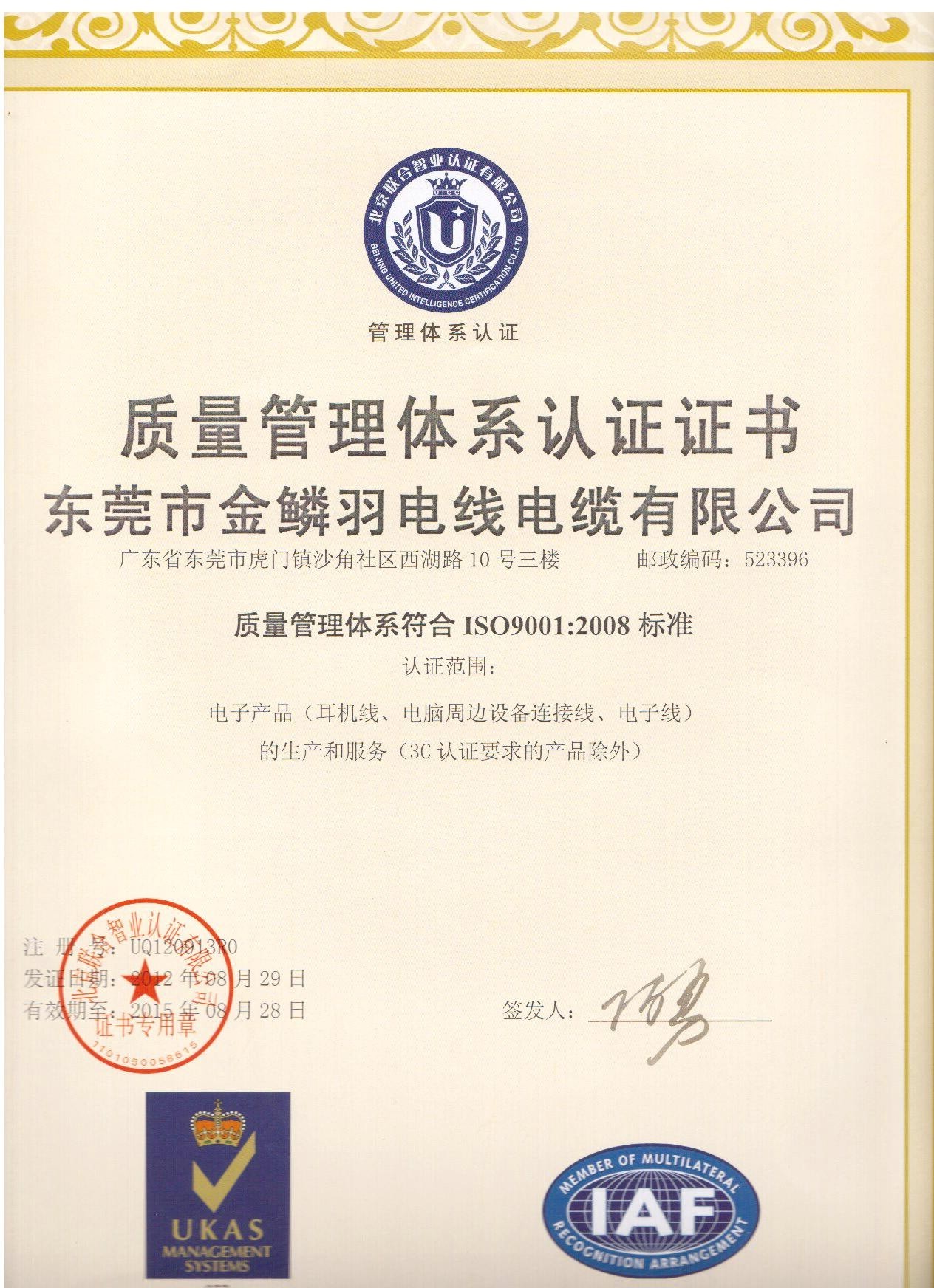 质量体系认证证书
