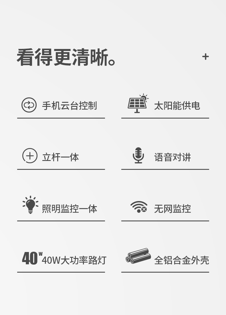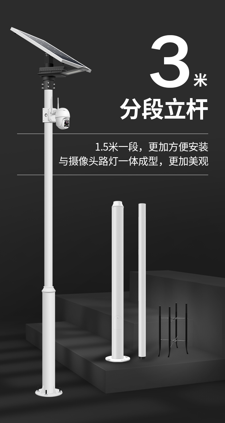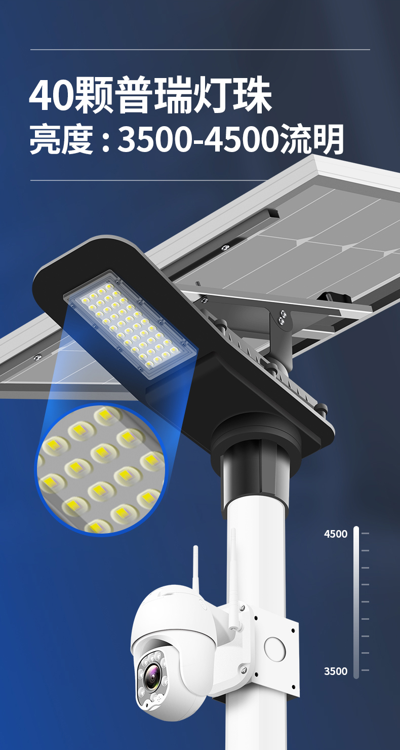 我公司结合LED太阳能路灯,4G视频监控系统做深度的整合,推出了 Sunipcam-60W50AH太阳能监控带路灯 系列,这款路灯采用了自动光控系统,晚上一直亮灯,同时视频监控可以通过手机控制