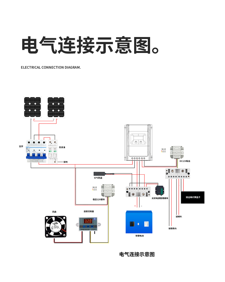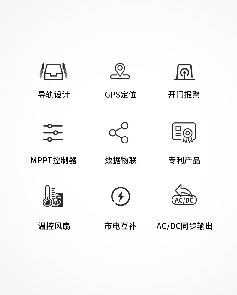 负载关闭报警,温度报警,   白天800-1700点光伏无电压报警。   电池电量低于10%报警。等功能,可按客户的更多要求进行定制。