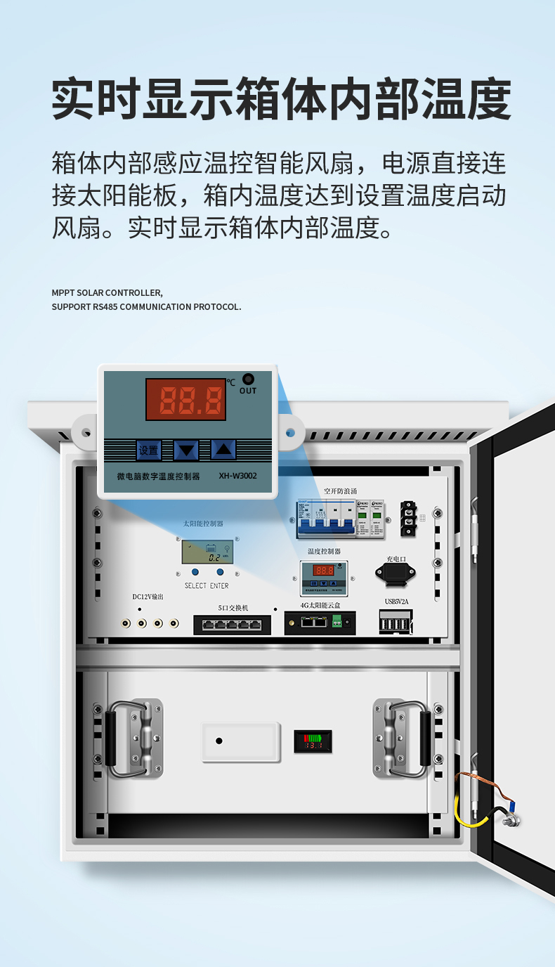 箱体内自动温控风扇,当箱体内温度达到设定傎,风扇自动启动散热。