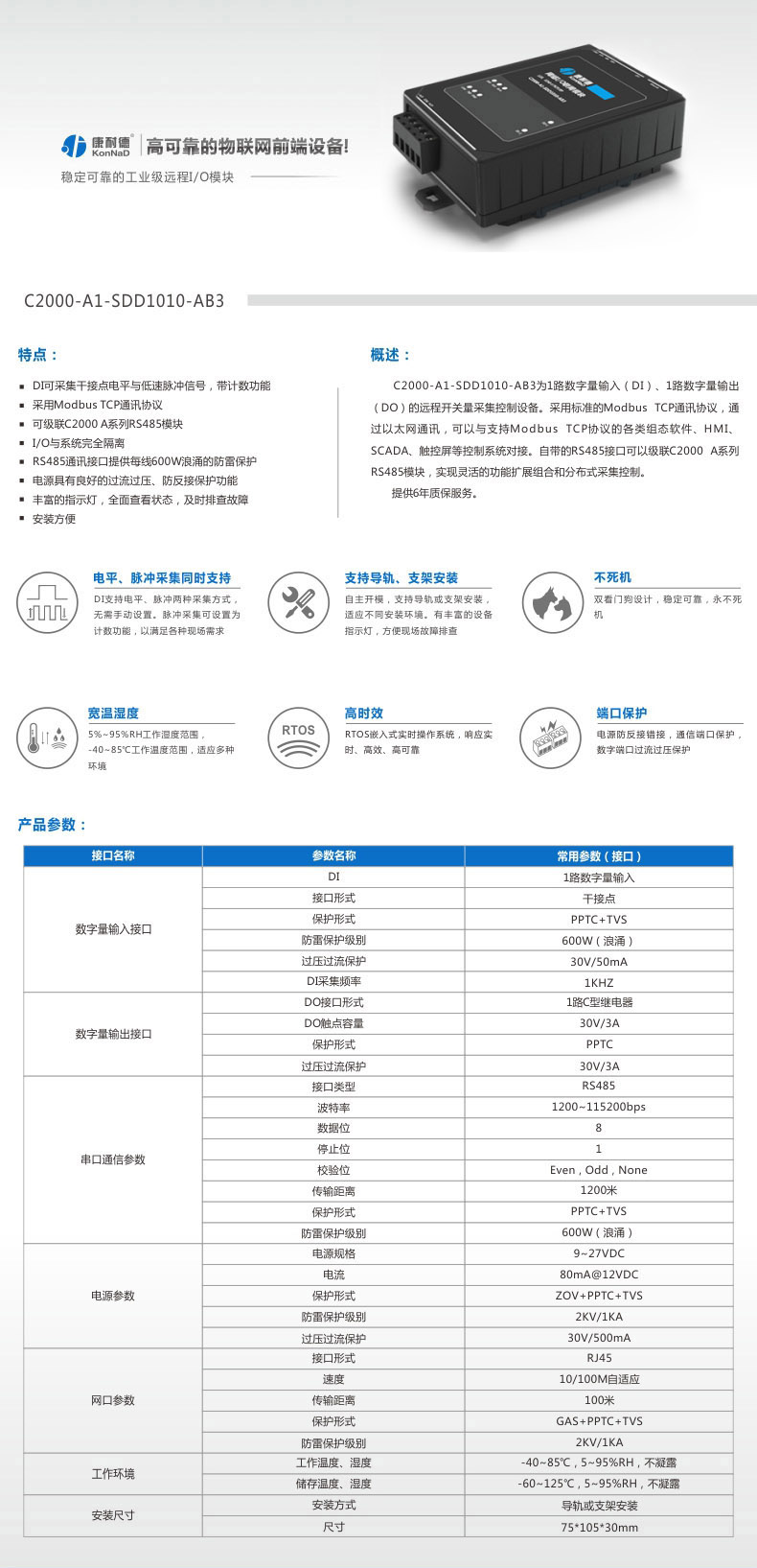 C2000-A1-SDD1010-AB3是数字量网口采集模块,其具备良好的扩展性,可灵活地通过自带的RS485总线级联康耐德同系列串口I/O联网设备,以实现各种数字量、模拟量的组合、扩展采集的功能。