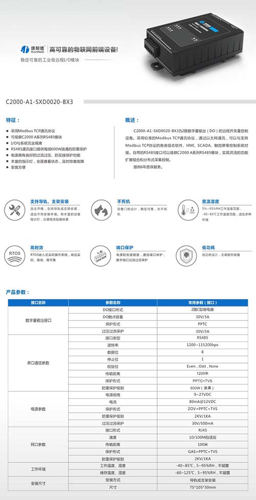 C2000-A1-SXD0020-BX3是数字量网络输出模块,其具备良好的扩展性,可灵活地通过自带的RS485总线级联康耐德同系列串口I/O联网设备,以实现各种数字量、模拟量的组合、扩展采集的功能。
