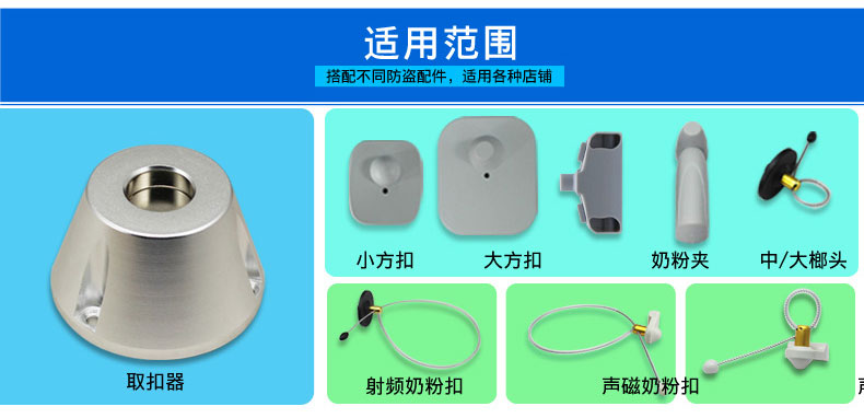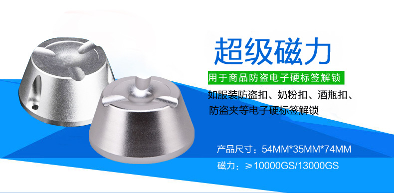 适用场所:适用于商场、超市、服装店、母婴店等,可以解锁服装防盗磁扣、奶粉磁扣、酒瓶磁扣、防盗夹等电子硬标签解锁。
