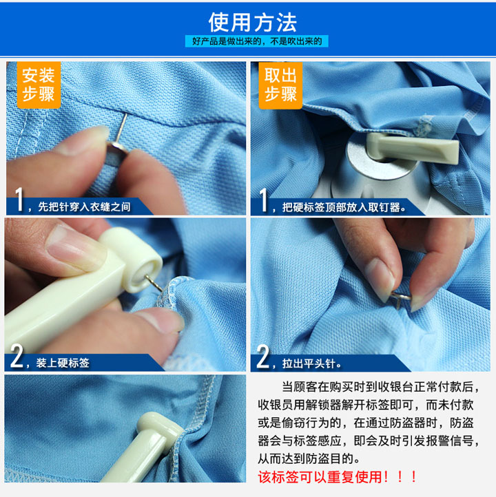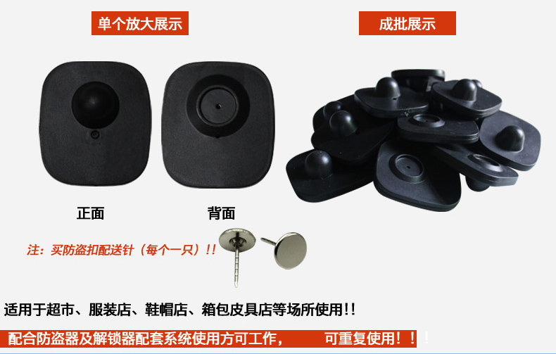 使用方法:配合声磁防盗器及声磁解锁器使用,可配防盗线圈和钢针