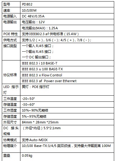 支持10/100M数据传输:支持IEEE802.3af标准,可提供12V直流电压,可为不支持PoE的终端设备提供数据和电力。