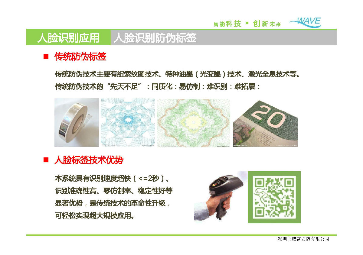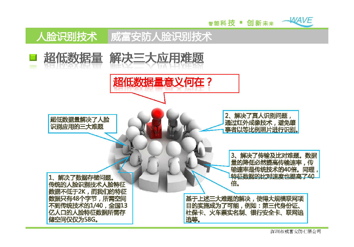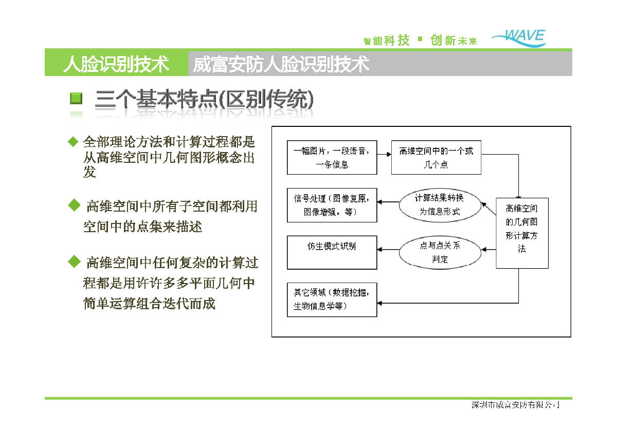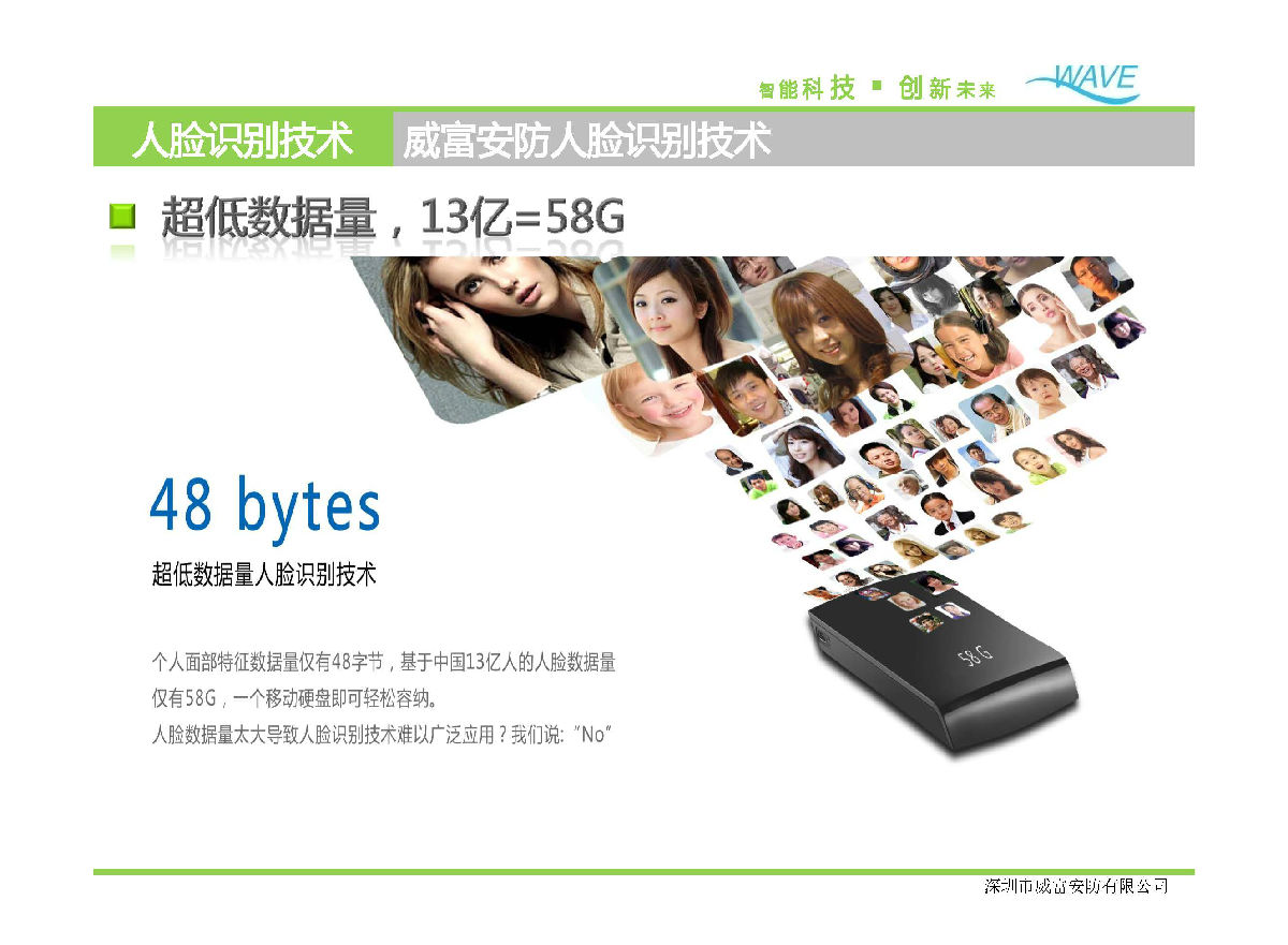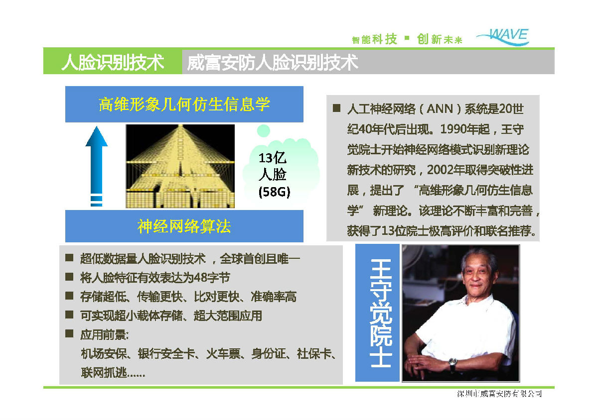 威富基于王守觉院士的高维形象几何仿生信息科学,创新研究出超低数据量人脸识别技术(被列入国家科技攻关计划、863计划、国家自然科学基金重大研究计划),将人脸特征有效压缩为48字节,是人脸识别技术领域的重大突破。