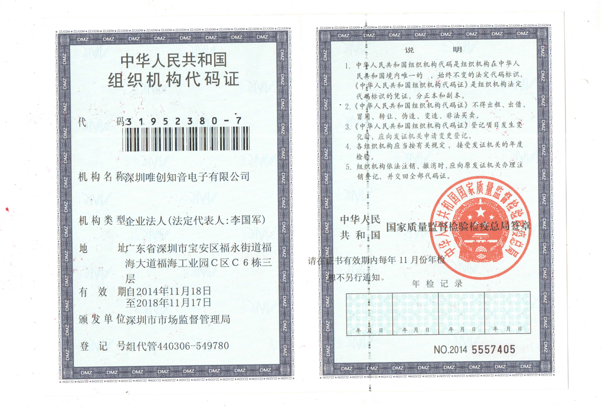 唯创知音组织机构代码证