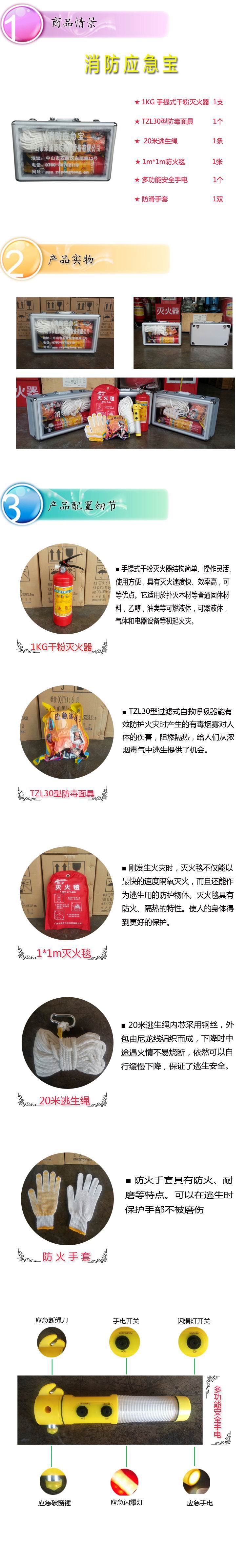 消防应急宝适用于家庭遇到初始火灾,及时应急逃生,使身体能够得到保护,尽早逃离火灾现产。消防应急宝包含:1kg干粉灭火器、30型防毒面具、20米逃生绳、灭火毯、多功能安全手电、防滑手套。